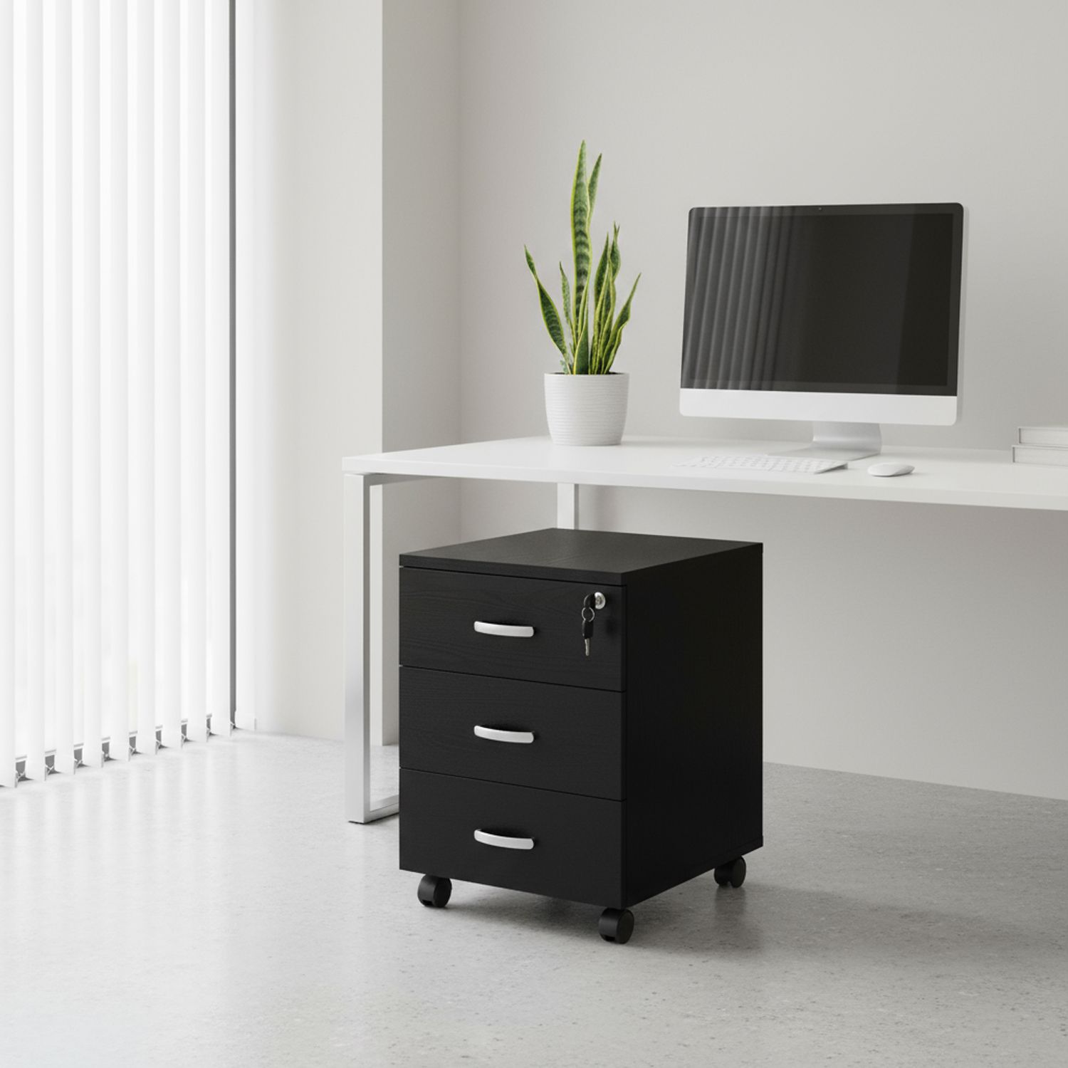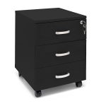 Cassettiera Office con struttura in melaminico con spessore da 18mm, 3 cassetti estraibili, chiave di sicurezza e 4 ruote girevoli. Disponibile in diverse colorazioni, ha un ingombro di 40 x 44 x 53 cm.